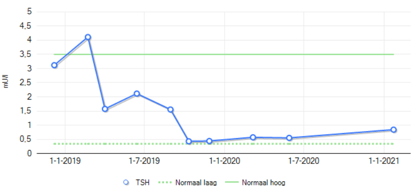 Above you can see the latest results, they are both within the boundaries of a goodworking thyroid. However when i look at the trend for the T4 (graph below) i do have some concerns since it’s an upward trend.
