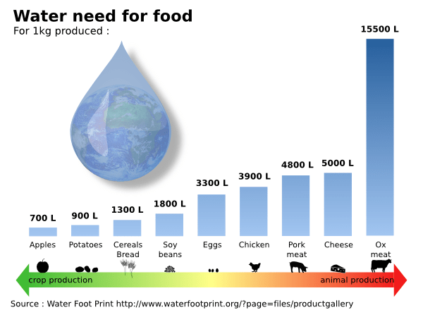 Everyone knows the agriculture sector is a large consumer of drinkable water but meat from large animals is really the topconsumer. Although I’m all in favor of eating a decent piece of meat now and then, it’s not that hard to do the math: eat less (cow) meat > less cows are needed > less water is used. The graph below illustrates this well.