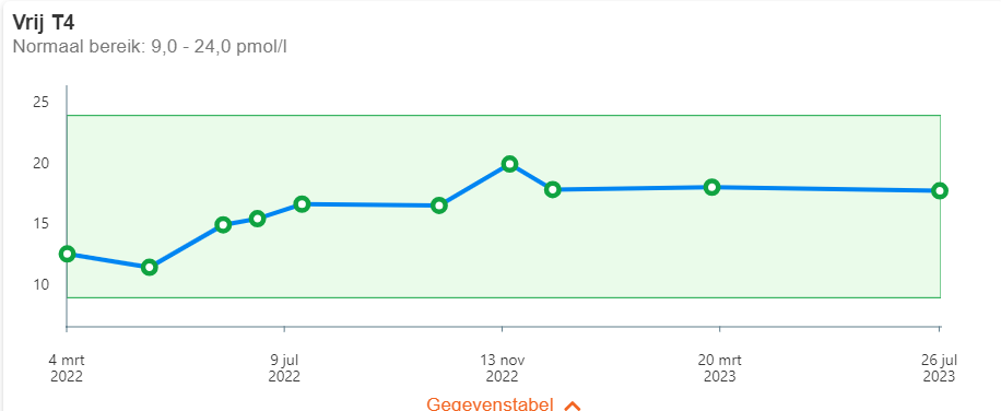 Below you can see the result of the latest TSH measurement and the trend of since march 2022 and as you can see, it’s been ‘in the green’ since may 2022 and virtually stable since end of november 2022.