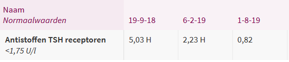As measuring is knowing, i wanted to do a few more tests. 1 Test, which my dietician advised, was to check for antibodies TSH receptors. Lots of thyroid-diseases are caused by auto-antibodies. They are created when the immunesystem accidentally sees thyroidcells as ‘alien’ to your body and starts creating antibodies to destroy these cells. So a high count is bad, low count is good. I did take some convincing the endicrinologist, most likely an insurance thing, but she eventually agreed. I took this test on the first of august. As you can see below the 2 measurements before my diet where above the norm, the last measurement was very low which is a good thing.