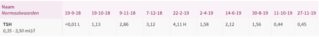 After summer we also decided to stop with the medication. I was on the lowest possible dosage of strumazol and the results were good. In the pictures below you can see my test results for the 2 things they usually test for, TSH and Free T4 (vrij T4). One thing to note is that on 19-10-2018 my free T4 was very low, almost having the effect of a too slow thyroid which is the opposite. To my surpise i was not called by anyone, most likely because it still falls within the 9-25 category, but this was (again) disappointing. I called them myself and based on that i lowered the dosage.